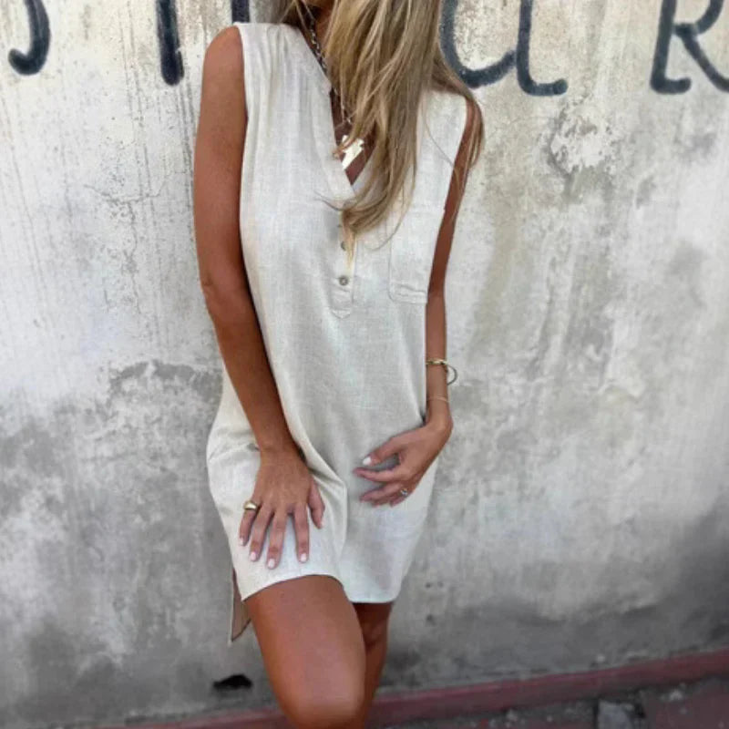 DE DAGELIJKSE CASUAL ELEGANTIE: Ontdek onze mouwloze jurk met een eenvoudig ontwerp, een flatterende V-hals en een elegante knoopsluiting. Deze jurk is perfect voor dagelijks gebruik dankzij de comfortabele snit en praktische zakken.