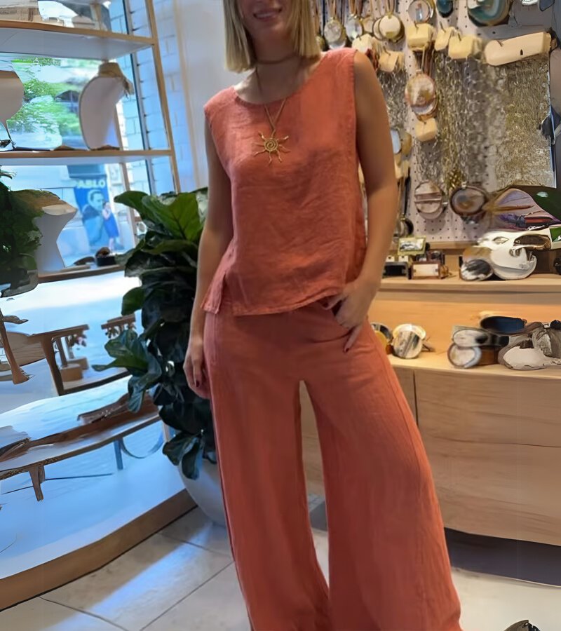 Ontdek het perfecte geheel voor de zomer: deze set van licht linnen biedt comfort en stijl in een tijdloos ontwerp. De mouwloze top zorgt voor een luchtige pasvorm, terwijl de ruime broek beweging en een verfijnde uitstraling garandeert. Ideaal voor warme dagen, perfect voor de stad, op vakantie of een aperitief buiten. Verkrijgbaar in zowel natuurlijke als moderne tinten, een must-have voor je seizoensgarderobe.